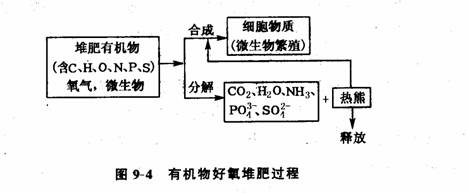 基本原理好氧堆肥是在有氧条件下,好氧微生物通过自身的分解代谢和合成代谢过程,将一部分有机物分解氧化成简单的无机物,从中获得微生物新陈代谢所需要的能量,同时将一部分有机物转化合成新的细胞物质的过程(图9—4)。