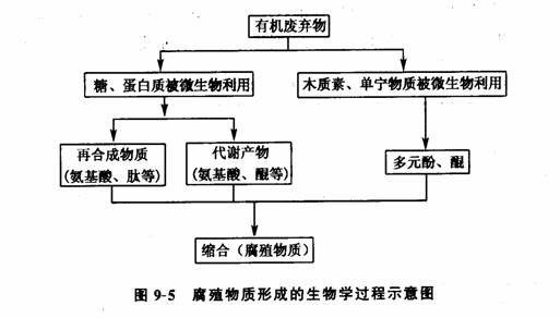堆肥的结果是废弃物中有机物向稳定化程度较高的腐殖质方向转化,腐殖质的形成十分复杂,其生物学过程示意如下(图9—5)。