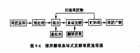 对于湿度较高的有机物,如城市污泥、畜禽粪便等在堆置前必须与干燥的蓬松剂或调理剂混合,使其混合后堆料的含水率为55%~65%。蓬松剂可采用各种农业秸秆、稻壳、木屑、树皮、甘蔗渣和干燥的回流堆肥产物等。其发酵工艺流程见图9—6。