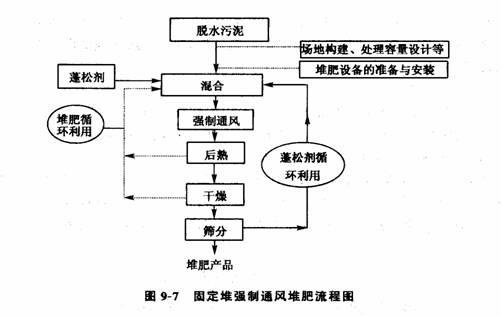 具体做法为:①将脱水污泥与蓬松剂混合,体积比可为1:1、1:2或1:3;②在堆肥场地上铺设小木块或蓬松剂约20cm;⑧在上述基础上,将污泥与蓬松剂的混合物堆成高,1.5—2m的垛;④将垛的表面覆盖一层过筛后的堆肥产物(厚约20 cm);⑤将鼓风机或抽风机与通风管道连接,肥堆堆置2d后开始通风,通风频率可以采用肥堆温度或氧气反馈装置自动调节,例如,在温度低于45℃时,风机开始工作,提供氧气,促进微生物的活动;当温度处于45~70℃时,风机停止工作;当温度高于70℃时,风机再度工作,以降低肥堆的温度。也可以通过定时器控制风机的工作,如可每隔3h通风15~30min;⑥若采用抽风方式,风机出来的气体通常先通过腐熟后的堆肥过滤脱臭,再排人大气;⑦通常堆肥3周后,肥堆翻堆一次,并停止通风,让其后熟,若需要得到高度腐熟的堆肥,后熟时间最好为30d以上;⑧堆腐后的物料通常需要干燥,可以采用自然露天晾干的方法,也可以重新将鼓风机开启,保持大风量来驱逐水分;⑨若堆肥中的蓬松剂{如小木块}需要循环利用,还必须对堆肥进行筛分;⑩在堆肥过程中注意监测肥堆的水分状况,如果太干,要在眼堆上浇水,或结合翻堆时加水。